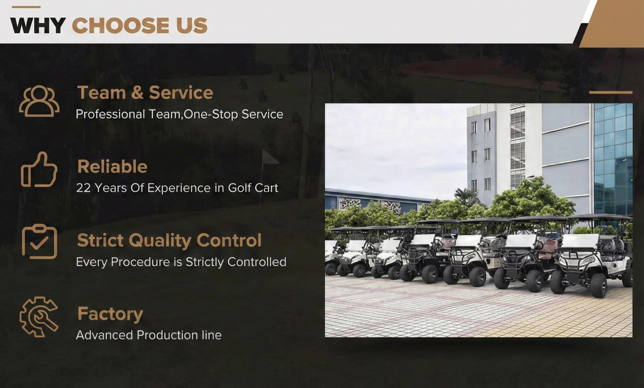A: With over two decades of experience in the golf cart industry, we have built a strong team of more than 20 engineers and 200 skilled staff. Our substantial production capacity, advanced technology, and reliable after-sales service ensure that our golf carts are not only fashionable, smart, and practical but also economical—making them a popular choice worldwide.